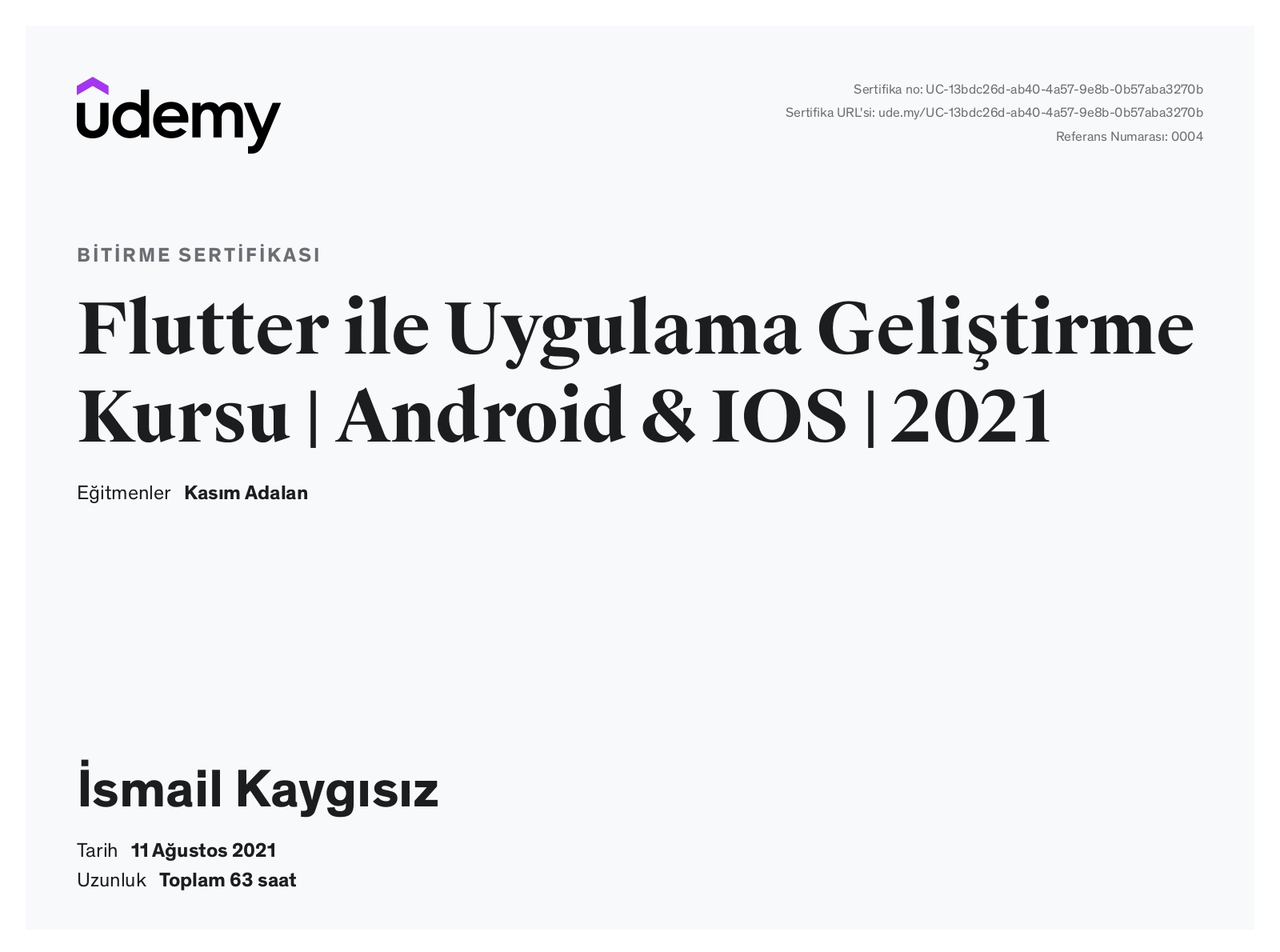 Flutter ile Uygulama Geliştirme Kursu | Android & IOS | 2021 kursunu tamamlayarak almaya hak kazandığım bitirme sertifikası.