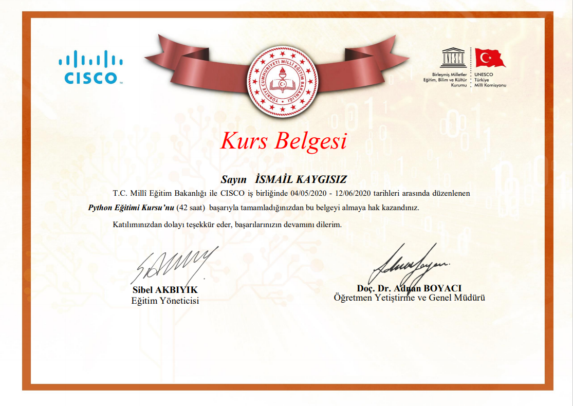 CISCO - MEB iş birliğinde düzenlenen 42 saatlik Python Eğitimi Kursu'nu başarıyla tamamlayarak almaya hak kazandığım sertifika.
