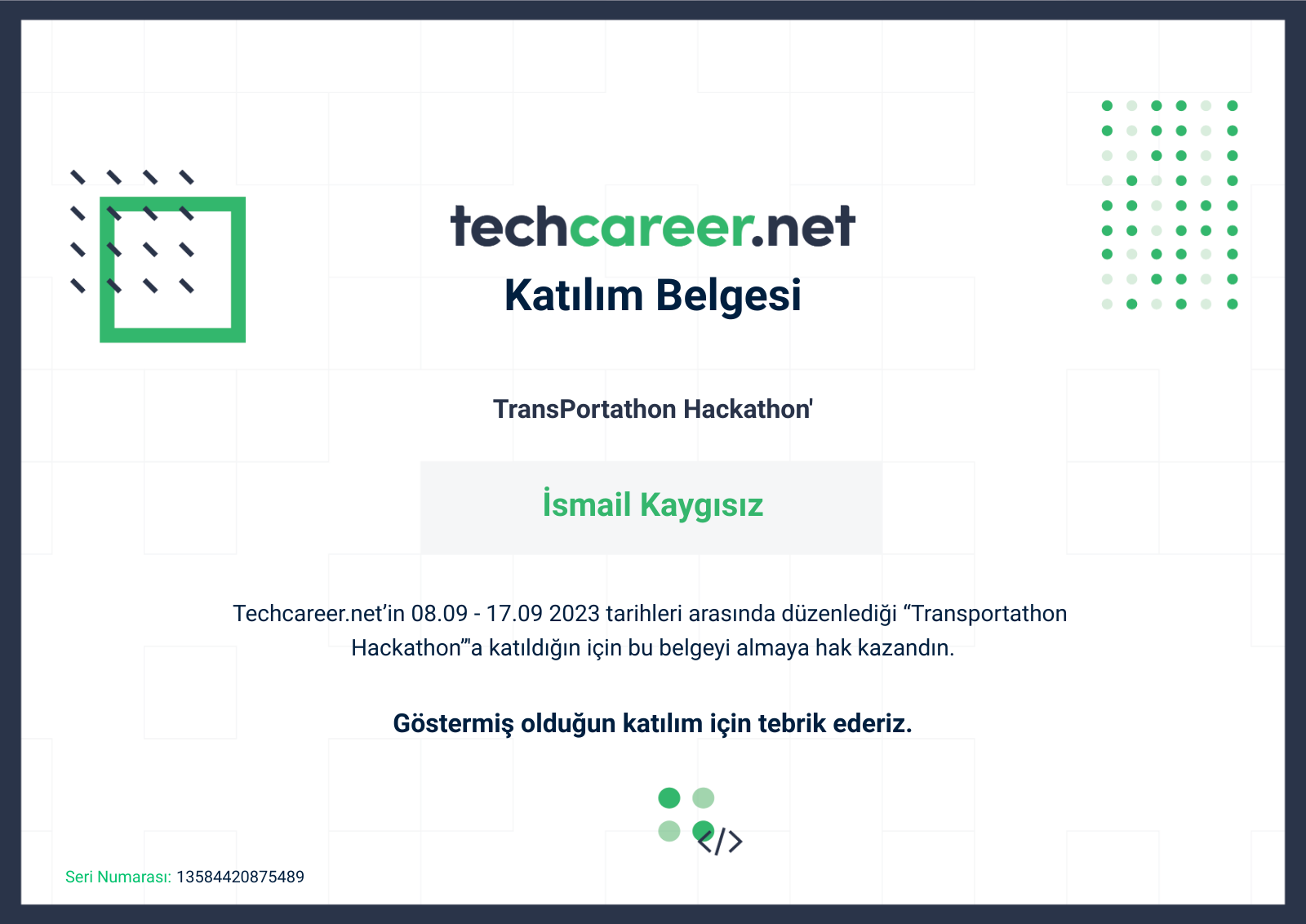 TransPortathon Hackathon yarışmasına katılım gösterdiğim için aldığım belge.