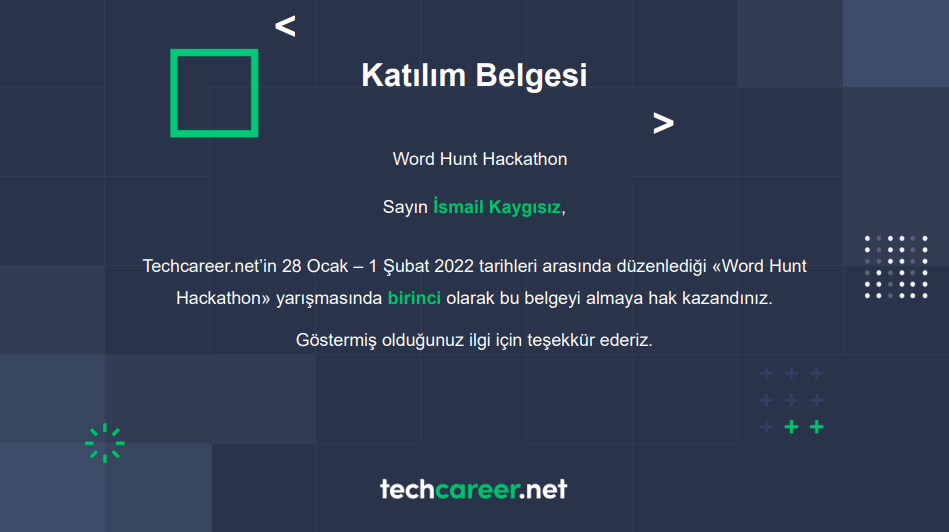 Word Hunt Hackathon yarışmasında ekip arkadaşımla birlikte elde ettiğimiz başarı sonucu almaya hak kazandığım belge.