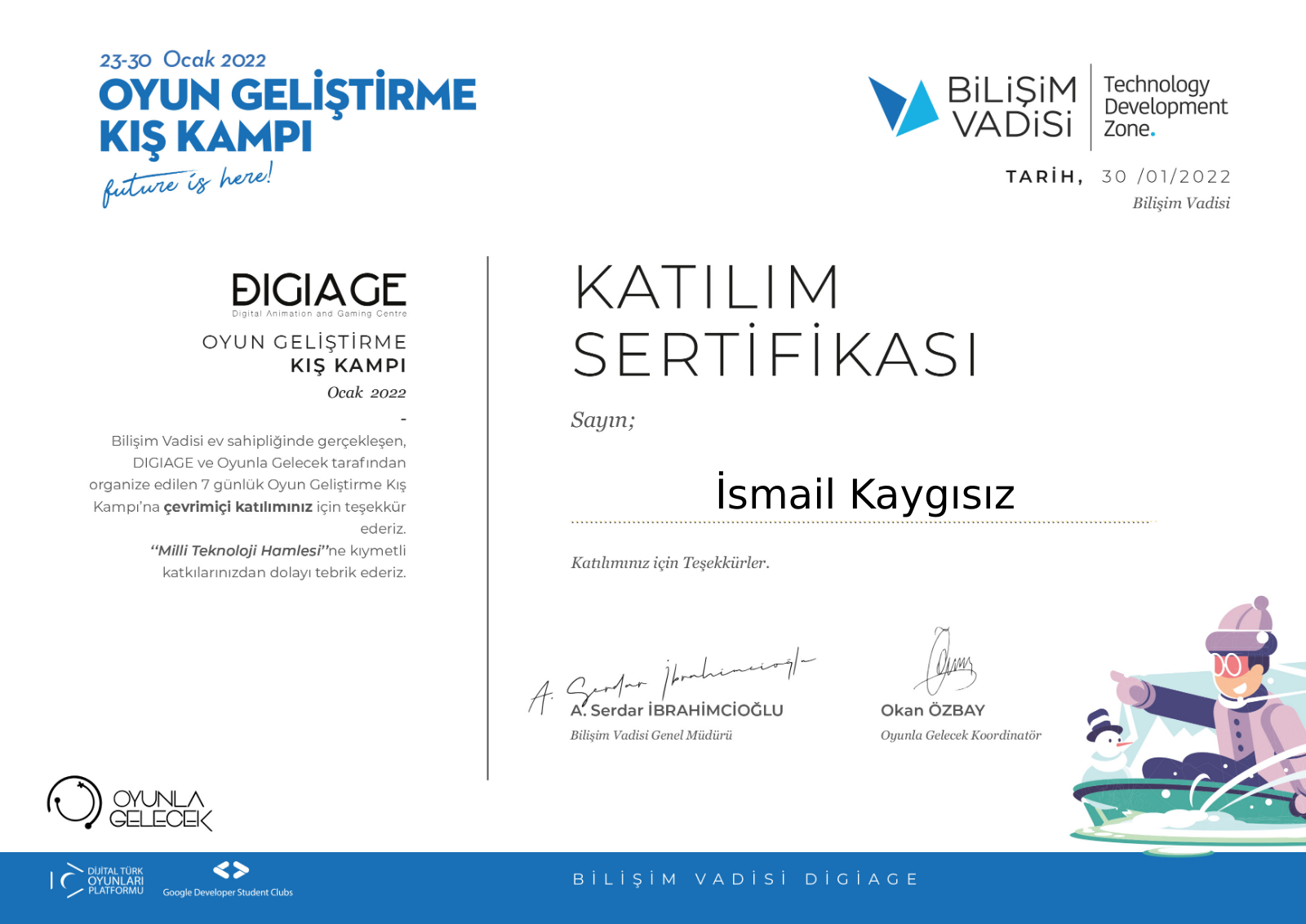 DIGIAGE Oyun Geliştirme Kış Kampı Katılım Sertifikası